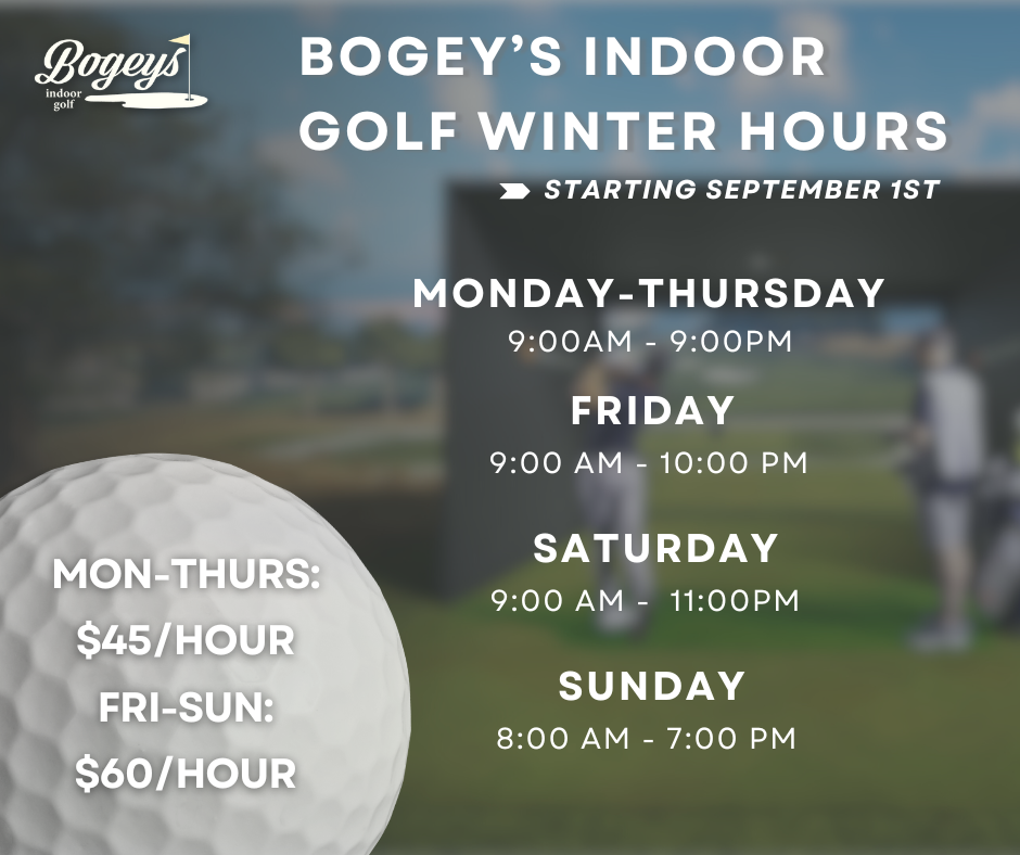 As the seasons shift, so do our hours! Starting September 1st, Bogey’s Indoor Golf will move to our winter schedule so you can keep swinging all season long—rain, snow, or shine.