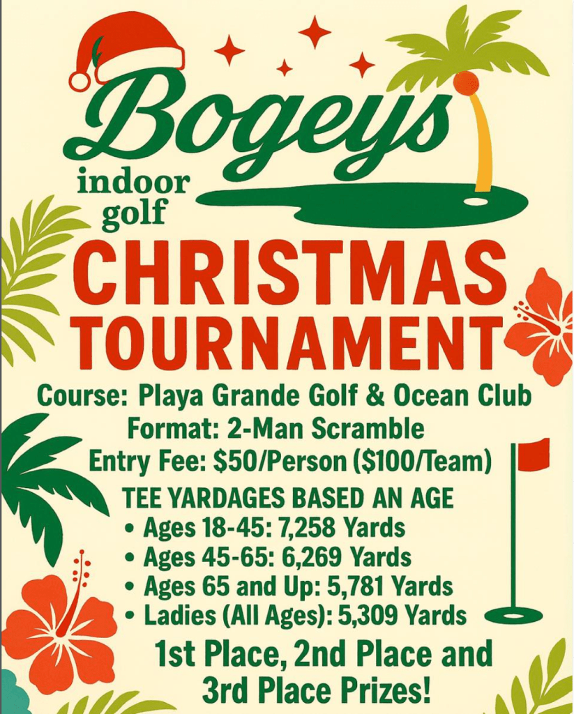Trade winter coats for island vibes and tee it up in paradise this holiday season. Join us at Bogey’s Indoor Golf for our Tropical Christmas Tournament, where festive fun meets friendly competition.
