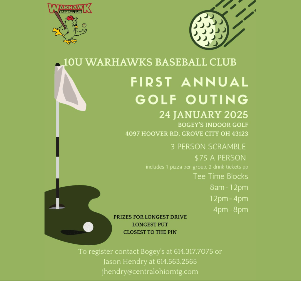 Kick off 2025 with a swing at something special! ⛳️ The 10U Warhawks Baseball Club First Annual Golf Outing is coming to Bogey’s Indoor Golf on January 24, 2025, and it’s shaping up to be a day full of fun, friendly competition, and community support.